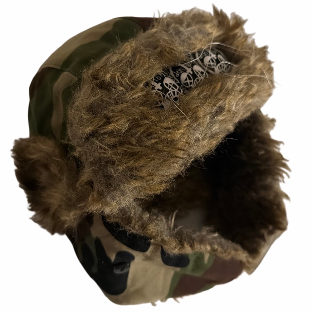 1 of 1 camo ushanka style trapper hat featuring 3 woven label mask logos sewn on center. Hand sourced and upcycled in New Mexico by me.