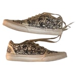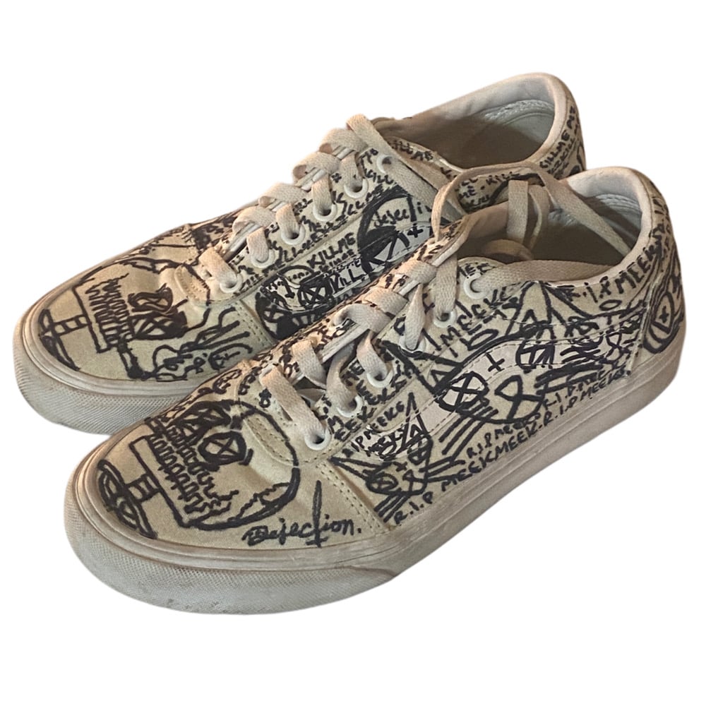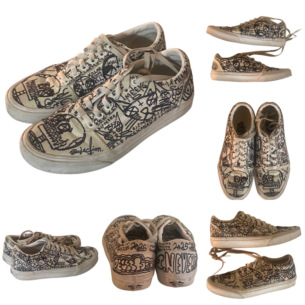 1 of 1 SIZE EU 38/ WOMENS 8.5 low top old skool vans. White/ drawn all over. Hand drawn accents all over a new pair of vans with a ‘dirtied’ appearance. I rly wanna keep these but dont need them as much as one of you does. Hand sourced and upcycled in New Mexico by me.