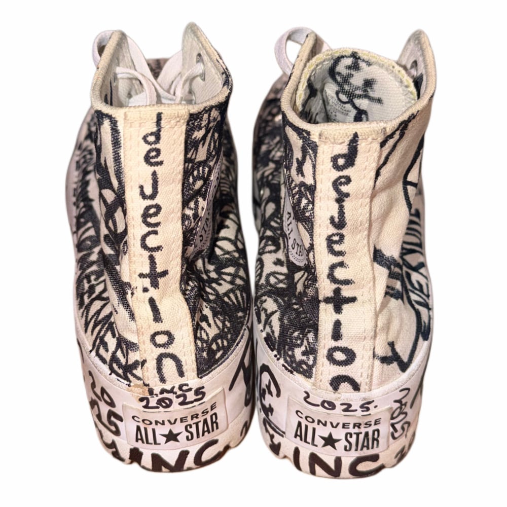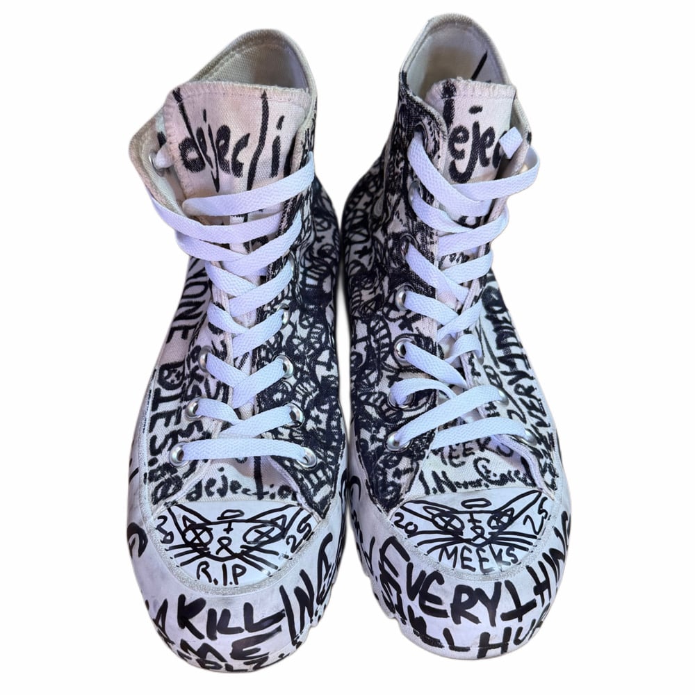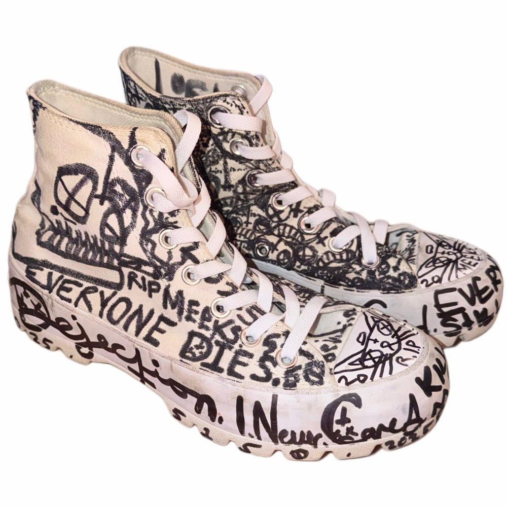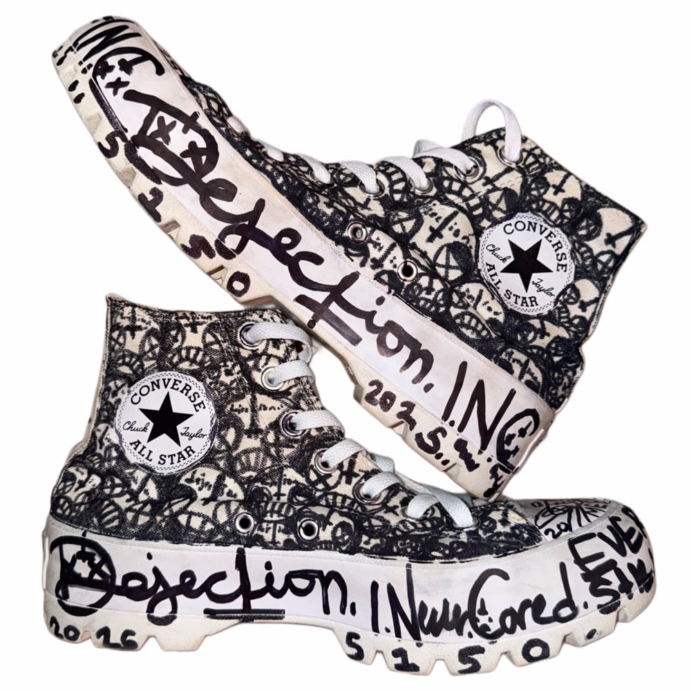 Comes with free hand signed business card and stickers. Hi top rugged sole Converse. SIZE EU 39/ 8 USA. SUPER COMFY NEAR BRAND NEW, lightly worn in with a ‘dirtied appearance’,. I WAS GONNA KEEP THESE BUT I CANT KEEP ALL MY ART I GOTTA LET THINGS GOOOOOOOOOOOO I Love yall!!!! Hand sourced and upcycled in New Mexico by me.